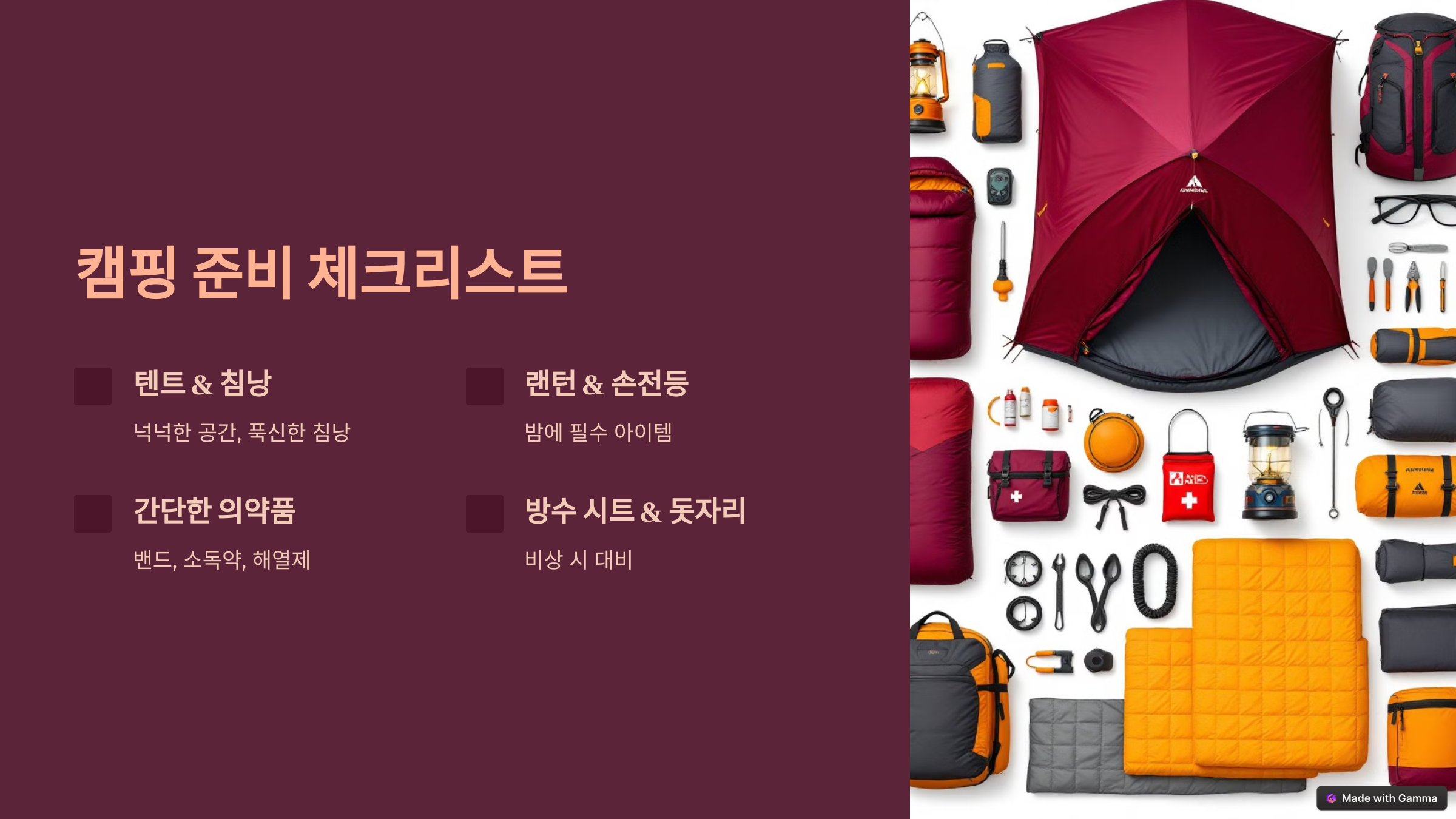 - A1: 텐트, 침낭, 랜턴, 코펠, 기본 의약품 등 필수품을 챙기세요.